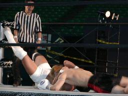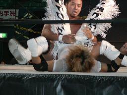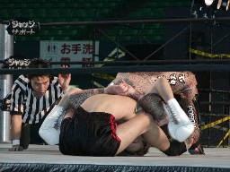 佐々木パワーボム狙う、MIKAMI背後に着地してスクールボーイ(左写真)、カウント2。鳥羽にタッチ。鳥羽ウラカンからマウントパンチ、押さえ込むがカウント2。10分経過。