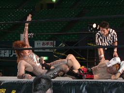 川内は高木の足にニースタンプ、ストンピング。婆沙羅入ってトーホールド。婆沙羅背中にパンチ入れてダブルアームスープレックス(左写真)、カウント2。川内にタッチ。