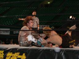 ポイズン4の字(左写真)、鳥羽引っくり返す。ポイズン戻す。MIKAMIがセントーンでカット。5分経過。