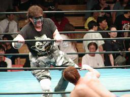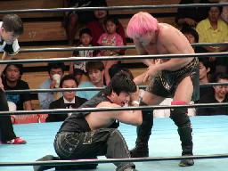 茂木がボディスラムからコーナーに上る。ポーゴがスローイングボディプレスの形でサポート(効果あったかどうかは?)。ポーゴ宇和野の口に鎌(左写真)。ポーゴロープに振って鎌攻撃、宇和野その腕にカウンターキック、鎌吹っ飛ぶ。宇和野エルボー連打、カウント2。