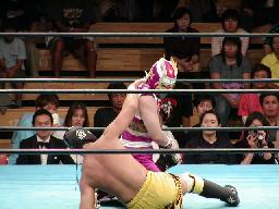 高智腕を取る(右写真)、上野切り返して腕にエルボースタッブ。高智切り返してスリーパー、上野は下から高智の顔面を蹴ってブレーク。ロックアップ、高智バック取る、上野腕取って切り返す、さらに切り返し合い、高智がロープ。再度ロックアップ、高智ロープに詰める、上野返してコーナーに押し込むと逆水平。上野対角線コーナーに振る、高智切り返して串刺しニーアタック。