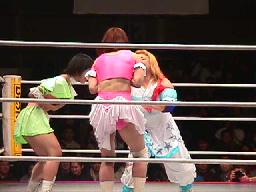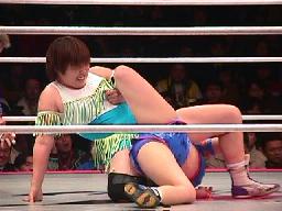 おばっちいきなり西と山本の胸を触るセクハラ(?)攻撃(右写真)。ヒップアタック連打、山本もコーナーに詰めてヒップアタック、山本かわして逆に串刺しドロップキックを食らう。