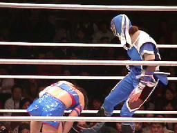 KAZUKIキャプチュード(右写真)、カウント2。KAZUKIコーナーに。ロゼッタ押さえる。フレイア上るがKAZUKIはこれを叩き落して延髄ニー、カバーはロゼッタがカット。KAZUKIロープに飛んでもう一発延髄ニー、足を固めてバックドロップホールド、カウント2。