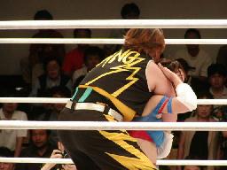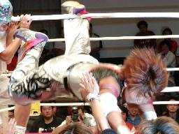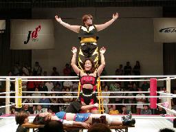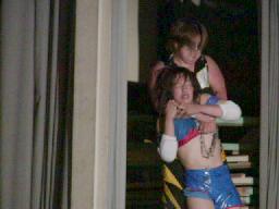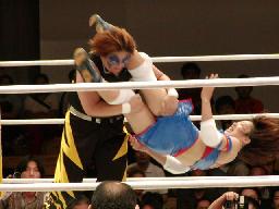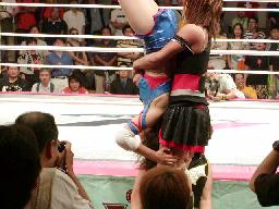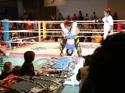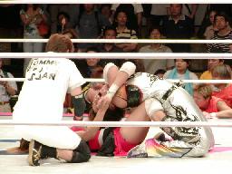 ブラディーが空中でブラディーEX(右写真)、レフェリー・トミー蘭がバルコニーから坂井のギブアップを確認する。