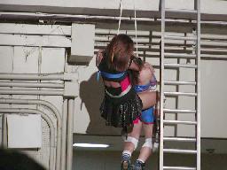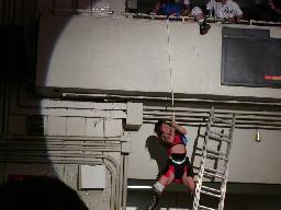 西バルコニーにスポットが当たるとそこにはブラディーと坂井が落とし合う姿が(左写真)。しかしすでにザイル装着済み。念のためにマットやハシゴも準備される。