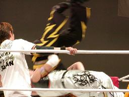 武藤コーナーに上ってミサイルキック、ファング場外転落、武藤すかさずトペ(左写真)。