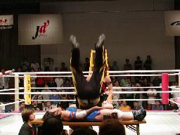 ブラディーは机の上で坂井にパイルドライバー(右写真)、カウント2。残り5分。リングに戻ってファングにタッチ。ファングバックドロップ。スーパーテラーズ勢がリングと南客席の間にハシゴを渡してその上にイスを積む。何する気?