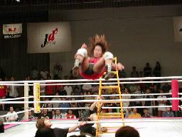 エプロンに出てハシゴの上にダブルのチョークスラム(右写真)、ファングがカバー、武藤がカット。