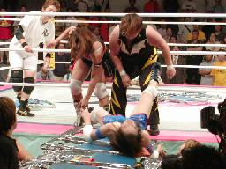 ブラディーロープに飛ぶ、武藤キャッチするとノーザンライトボム(orちょっと低い垂直落下式ブレーンバスター。左写真)。もう一発、今度はイスの上に、カバー、カウント3。