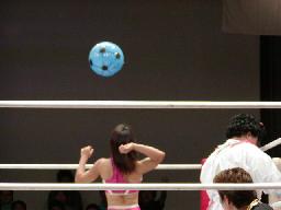 大森リバースフルネルソン?(左写真)賀川「何すんのよお〜」何するんでしょうね?賀川「やだ、ケーコ助けて〜!」古田言われた通りカットに入る。賀川逆さ押さえ込み、カウント2。大森は柏田にタッチ。5分経過。