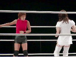 元気コーナーに振って側転エルボー、おばっちかわしてついに元気をストッキング攻撃の餌食に(左写真)。元気すぐに脱ぐ。そこにおばっちコーナーからクロスボディ、カウント2。おばっちヒップアタック、元気キャッチ。亜利弥'がハエタタキ渡す。これでピシピシ叩いてブレーク。元気が亜利弥'を脅す。そのスキに後ろに回ってカンチョー攻撃。