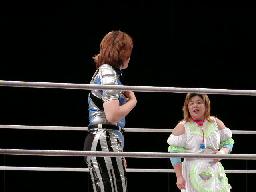 「NEOから緊急参戦!」の元気美佐恵、相手はおばっち飯塚。確かに急に決まったようだが「緊急」というもんでもあるまい>このカード。おばっち「あんたほんとに元気?元気かどうかアタシが調べてあげる。」と聴診器で検査。「あんた元気じゃないわね。喘息気味。」・・・・・おばっちのギャグはついていけないのが多い。元気も「調子に乗ってんじゃねえ!」とハタく。