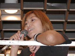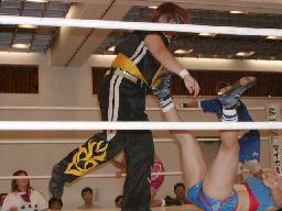 丸山ロープに押し込んで反動で飛ばそうとするが(左写真)KAZUKIブロックして逆に丸山を飛ばす。KAZUKIサミング、髪ひっぱり。