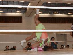 山本いきなり回転エビ、カウント2で西返す。山本コーナーに振る、西切り返す、山本セカンドロープに飛び乗って、突っ込んできた西に飛び付くとモンキーフリップ。飛びついてもう一発モンキーフリップ(右写真)。山本コーナーに振って突進、西かわして逆に串刺しドロップキック、コーナーで踏みつけ。