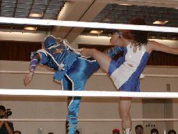 乱丸ホイップ、首投げからサッカーボールキック、ロープに振ってスピンキック、亜利弥'もスピンキック出して見事な相打ち(左写真)、両者とも足痛める。乱丸スクールボーイで丸めてからヒザ十字、亜利弥'ロープ。乱丸足に蹴り入れて逆エビ、亜利弥'ロープ。亜利弥'立ち上がってエルボー、乱丸も打ち返す。亜利弥'ロープに飛ぶ、乱丸カウンターのトラースキック。乱丸フライングメイヤーからグラウンドヘッドロック、亜利弥'ヘッドシザーズで返す。