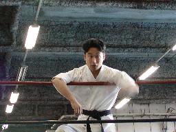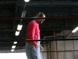 リベンジャーキック、ハトヘッドロック、コーナーに振ってスペシャルハトキック(左写真)、しかし効き目なし。もう一発ハトキック、コーナーに上る。
