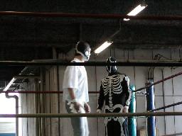 デモニオラリアット、ブレーンクロー(右写真)で押し倒す。スーパームクッ。スーパーロープに振ってショルダークローで押し倒す、カウント2。スーパーロープに振ってチョップ、デモニオかわしてラリアット。