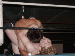 ロックアップ、ヘッドロックからロープワーク、ホンモノ足を取って逆エビ固め(右写真)からSTF。