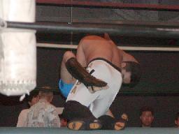森谷コーナーに詰めてパンチ連打、フライングメイヤーからグラウンドヘッドロック。リリースしてフィストドロップ。サーフボードストレッチに取(左写真)る。森谷スリーパー、リリースしてコーナーに振る、V3カウンターのトラースキック。エルボードロップからエプロンに出てスワンダイブ式ボディプレス、カウント2。5分経過。