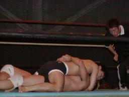 森谷ペディグリーの体勢、V3踏ん張り、逆に持ち上げるとブルズ・ポセイドン風に頭から落とす。V3コーナーに振って側転エルボー、森谷かわしてDDT。森谷ラリアットから再度ペディグリーに(右写真)、今度は決まってカウント3。