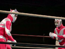 森谷がカベジュラ・コントラ・マスカラルールに従いV3のマスクをはがそうとしたとき、どこからかもう一人のV3が現れV3をピンチから救い(左写真)、控え室に連れ帰る。第1試合、第2試合とも謎を残したなあ。