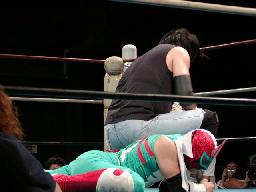 タテオカキックで倒したワンダーマンが四つんばいの状態なのにさらに蹴ってしまい減点1。しかしその後も蹴りで崩しては絞め、の連続でエスケープ、最後はギブアップを奪い勝利。