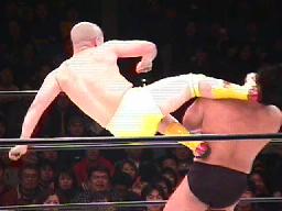 両者ロックアップ、関本がロープに押し込む、珍念は体勢を入れ替え張り手。珍念ヘッドロック、関本ロープに振る、タックルは意外にも互角。さらにタックル合戦、珍念が相手のエルボーをかわしての3発目で関本を倒す。ストンピング入れ、ロープに振ってドロップキック(右写真)、カバーするがカウントは2。