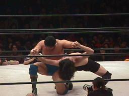テイオーは鉄柱4の字、獅龍も背中にヒザを押し付ける(左写真)。獅龍戻す。風神はコーナーに帰って西田にタッチ。10分経過。