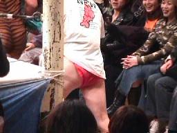 つぼ、今日はスリッパではなく草履をはいている(右写真)。どこから持ってきたのかと思ったら人生のを盗んだらしい。ボディチェックの際に見つかりテッドにハタかれる。人生は怒らず。つぼは篠塚リングアナが「第4試合30分一本勝負・・」と言った瞬間に持ってた骨で急所打ち。不意を突かれて悶絶する篠塚リングアナ。リングアナも大変だ。