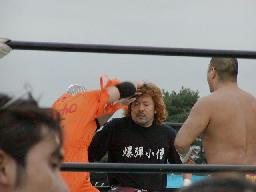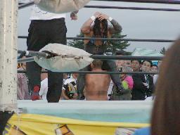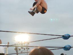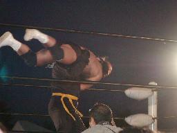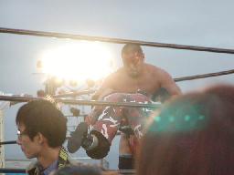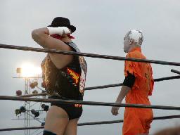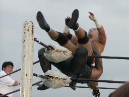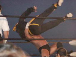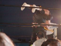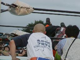 浜田コーナーに振る、ペンタゴン切り返す、突っ込んできたところに浜田カウンターキック、スイングDDT狙うがペンタゴンは持ち上げて後方に投げ捨てる(左写真)。ペンタゴンコーナーに上ってダブルアックスハンドル、浜田場外転落。