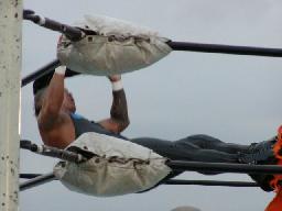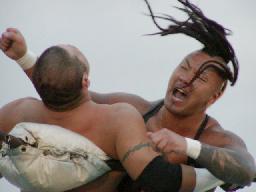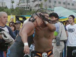 ペンタゴンドロップキックをはさんで再度バイアグラドライバーの体勢、担ぎ上げられたところで(右写真)浜田はスイングDDTに切り返す。浜田腕ひしぎ十字固めに、ペンタゴンしばしこらえるがついにはギブアップ。