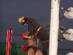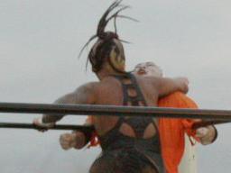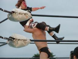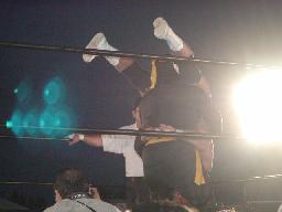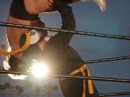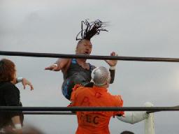 旋回式マルティネーテ(右写真)、カウント2。ペンタゴンバイアグラドライバー狙う、浜田着地。浜田逆に肩に担ぐと珍しいTKO、カウント2。浜田コーナーに振って串刺しエルボー、ペンタゴンをコーナートップに上げて浜ちゃんカッター、ペンタゴンこれを2で返す。