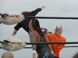 場外の西田。まるっきりスパイク・ダドリーだなあ。