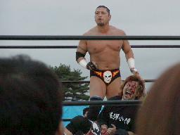 浜田ゆっくり入場(右写真)。浜田がボディチェックを受けている時に先制攻撃。ペンタゴンロープに振ってラリアット、浜田もラリアットで返し相打ちに。浜田先に立ち上がってストンピング。コーナーに追い込んで踏みつけ。ロープに振ってラリアット。座らせてエルボースタッブ、ラリアット、カウント2。
