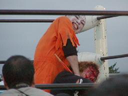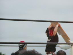 西田は東郷をリングに戻すとウラカン・ラナ、カウント2。ヘッドロックに取ってダドリードッグ。うははは「ジャイアント・キラー」スパイク・ダドリーそんままや。西田カバー、296が机の破片持ってカットに入るが西田かわして東郷に誤爆。西田机の破片取り上げて296を殴打(右写真)。