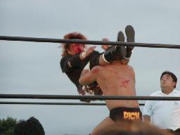 東郷は机の破片で西田の頭を殴る。西田流血(左写真)。ロープに振ってコブラクロー、テッドは反則を取る。カウント4でリリース。ロープワーク、東郷がテッドに激突して場外にふっ飛ばしてしまう。