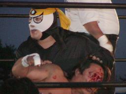 ペンタゴンはイスを持って突進、浜田の頭に直撃。ペンタゴンさらに浜田を客席に投げ込んでイス攻撃。リングに戻す。浜田流血(右写真)。ペンタゴンは浜田の顔面にドロップキック。ボディスラムからエプロンに出てトペ・アトミコ。