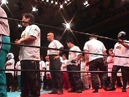 サスケ、セコンドに付いたミステル・カカオに「お前なんで付いて来るんだ?」と文句。そのスキにNANIWAが背後から急襲、場外戦に。リレー少年はタイガーを蹴りまくる(右写真)。浜田とグレートがリングに戻る。グレートボディスラムからギロチン、カウント2。サスケ入る。グレート急所打ち、NANIWA入って2人でキック。NANIWAがスリーパーに捕らえグレートがドロップキック。NANIWAチョーク。リレーキック、ストンピング、グレートにタッチ。グレート逆水平、急所打ち。