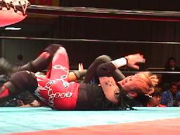 伊東を邪道と外道が抱え上げて田中がコーナーからスーパーパワーボム(右写真)、関本がカット。邪道がリングに残る。伊東スクールボーイ、カウント2。伊東回転エビ、邪道こらえる。テイオーディスカスエルボー、関本ラリアットで回転エビ完成、邪道は2でキックアウト。