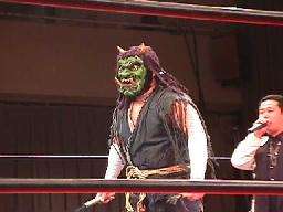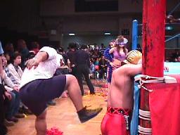 山おやぢ入場(右写真)。GYAOPPI!は四つんばいのためリングに上がれない。