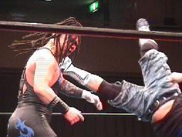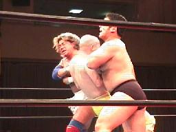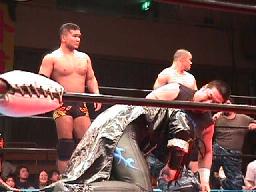 田中ビッグブーツ、カウント2。逆エビ、伊東ロープ。コーナーに詰めてショルダータックル連発。邪道を呼び込んでダブルタックル、邪道カバー、カウントは2。邪道バックドロップからカバー、関本カット。外道にタッチ。ロープワークから伊東ドロップキック、ようやくテイオーにタッチ。テイオーは外道、田中にテリー風パンチ連発(右写真)。外道にディスカスエルボーからラリアット、カウント2
