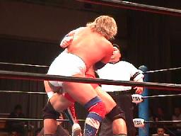 獅龍が入って伊東を場外に出すと場外へのトペ・アトミコ。関本と珍念がリングイン、関本スピアー、パワースラム、カバーは獅龍がカット。テイオー入って「ファイト一発!」と叫ぶとテイオーのディスカスエルボー(左写真)から関本ラリアットで珍念をフォール。