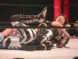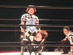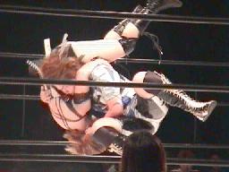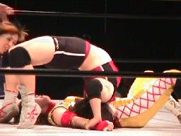 京子をリングに戻す。ASARIがコーナーから飛んでコルバタ(右写真)、カウント2。下田入ってイス攻撃、京子をイスに座らせてASARIとダブルのミサイルキック。ASARIがスカイツイスター狙ってコーナーに上る、京子後ろから捕らえてバックドロップ。京子上る、今度は下田がバックドロップ。ASARIがコーナーからダイビングプレス、カウント2。