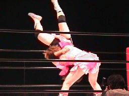 下田オースイスープレックスの体勢、ASARIが毒霧、京子かわして下田の顔面に誤爆。京子スクールボーイ、下田2で返す。京子は米山にタッチ、米山を肩に乗せてファンタスティックフリップ(左写真)、カウント2。米山ロープに飛ぶ、下田カウンターキックから押さえ込んで3カウント。