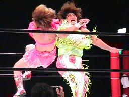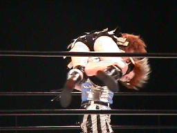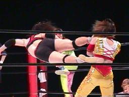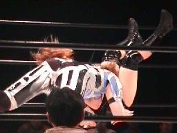ASARIロープに振る、京子切り返してラリアット(左写真)、ASARI一回転、京子カバー、カウント2。ナイアガラドライバーはASARIブロック、ロープに飛んで大車輪式ヒッププレス、これは失敗。京子引き起こしてラリアット、カウント2。10分経過。