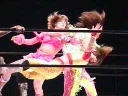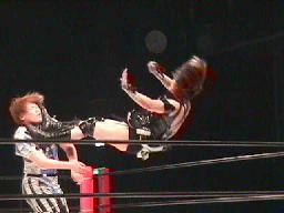 下田も入ってダブルでロープに振りキック。コーナーに振る、米山ASARIの突進をかわしてドロップキックで反撃(右写真)、ようやく京子にタッチ。