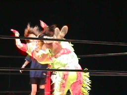 田村ロープに振る、元気切り返して担ぎ上げるとエアプレンスピン(右写真)から投げ落とす。元気コーナーに振って突っ込む、田村エルボー。元気逆水平連打。元気バック取る、田村ヘッドロックで締め上げる。元気ロープに振ってタックル。田村エルボーで元気を場外に落とす。元気は田村を客席に投げ込む、2度目田村切り返して場外でジャーマン。