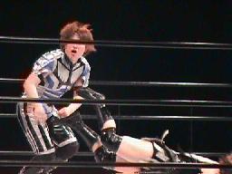 田村キック、DDT。足取ってヒザ十字固め(左写真)、元気ロープ。田村足4の字、元気引っくり返す、田村もう一度引っくり返す、元気ロープ。10分経過。