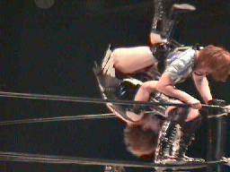 元気コーナーに振る、田村コーナーに飛び乗る、元気追いかける、田村飛び越えて回転エビ。元気立ち上がる、田村下からヒザ十字、元気ロープ。田村低空ドロップキック2発、3発目元気かわしてロープに飛ぶ、田村カウンターの低空ドロップキックからヒザ十字固め、元気ロープ。田村コーナーに上る、元気も上る、田村雪崩式回転エビ(右写真)、カウント2。15分経過。