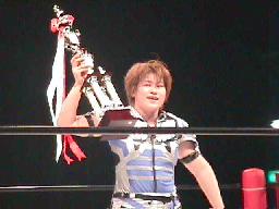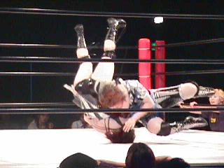 田村裏ダブルリストアームサルト狙う、元気ブレークするとアッパー掌底2発からGドライバー(左写真)、片エビに固めカウント3。
